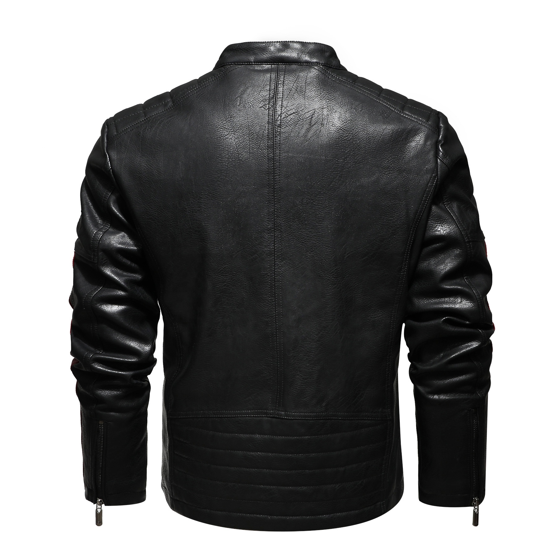The sleek black finish is accented with bold red and white racing stripes on the shoulders and sleeves, adding a touch of sporty elegance to your look. A stand-up collar with snap button closure enhances protection against wind, while multiple front zipper pockets offer both utility and a rugged aesthetic.