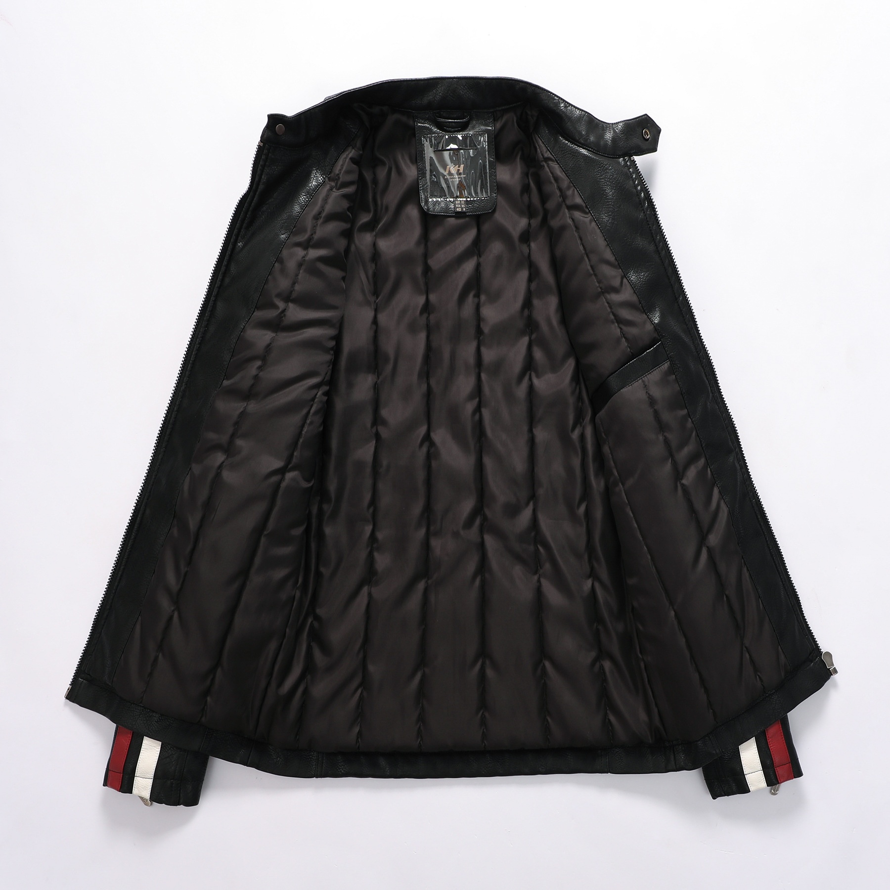 The jacket features smooth zippers, precision stitching, and a tailored fit that complements the masculine frame, ensuring you look sharp wherever you go. The inner lining provides comfort and warmth, making it an ideal pick for both cool weather rides and casual outings.