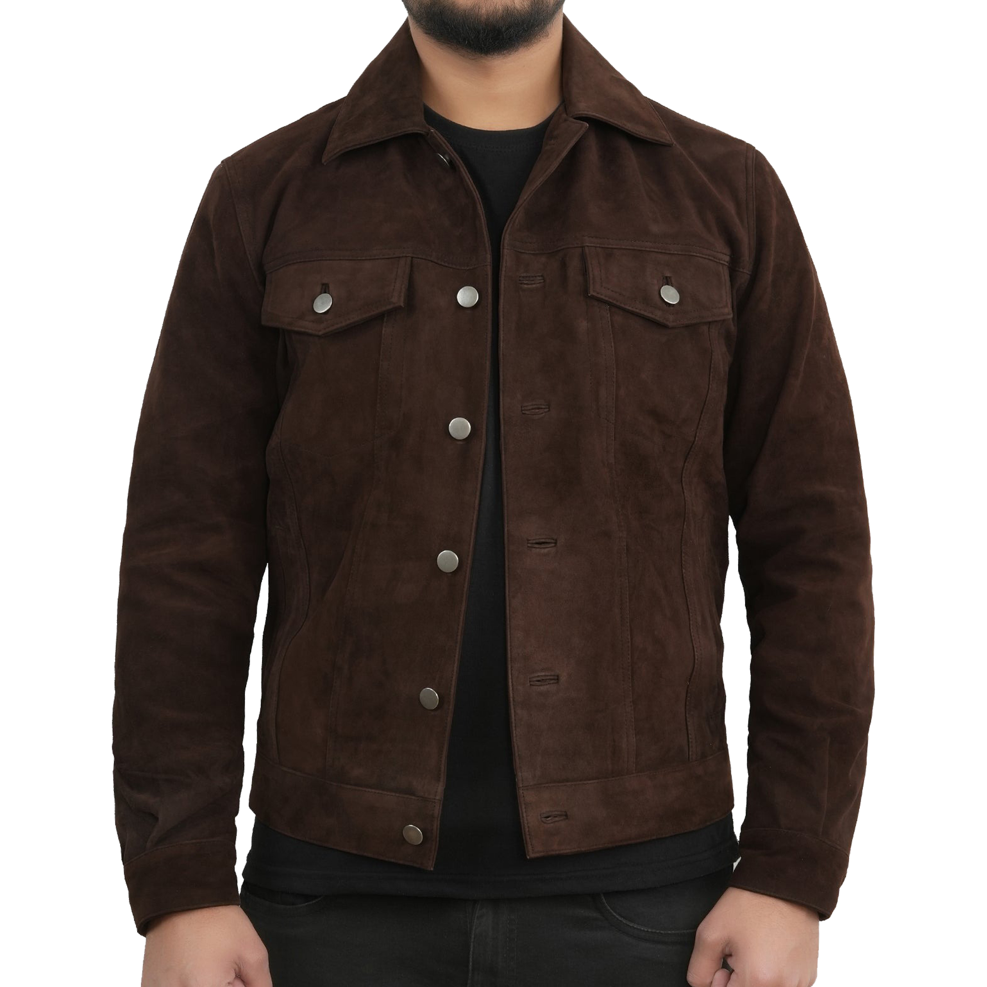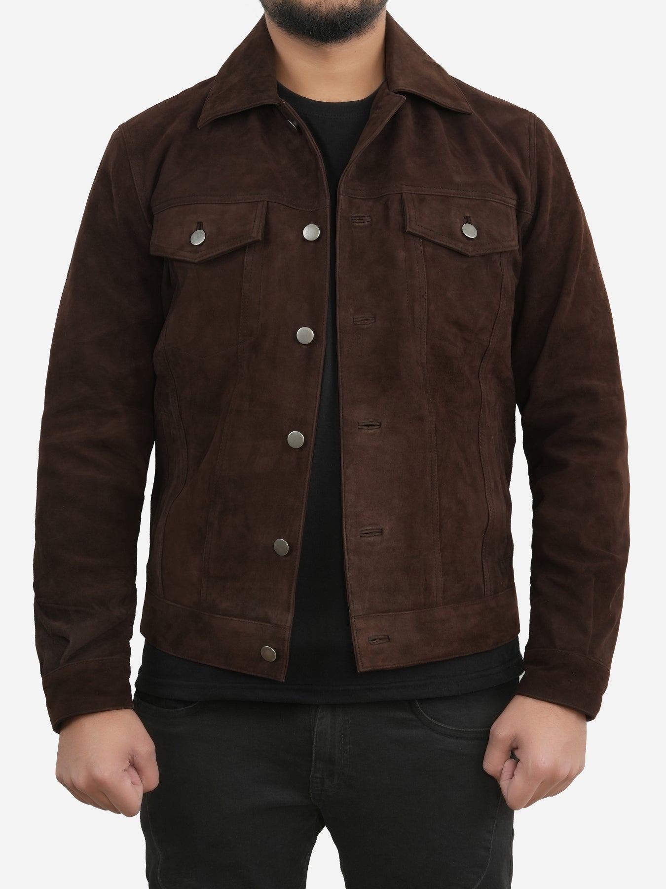 Designed with a classic cowboy silhouette, this jacket features a soft, velvety suede texture that feels as good as it looks. The comfortable inner lining ensures warmth and ease, perfect for cool evenings or casual outings. Its rich dark brown color adds depth and elegance, pairing effortlessly with denim or chinos for a bold, masculine look.