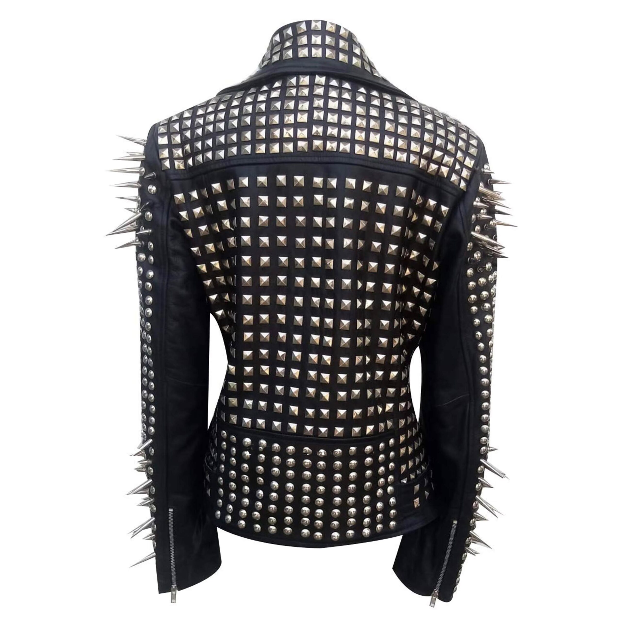 The sleek black finish enhances its timeless biker appeal, while the slim-fit silhouette perfectly contours your body for a flattering look. Embellished with metal studs and sharp spikes, it reflects the rebellious spirit of punk culture, offering a fierce combination of style, strength, and attitude.